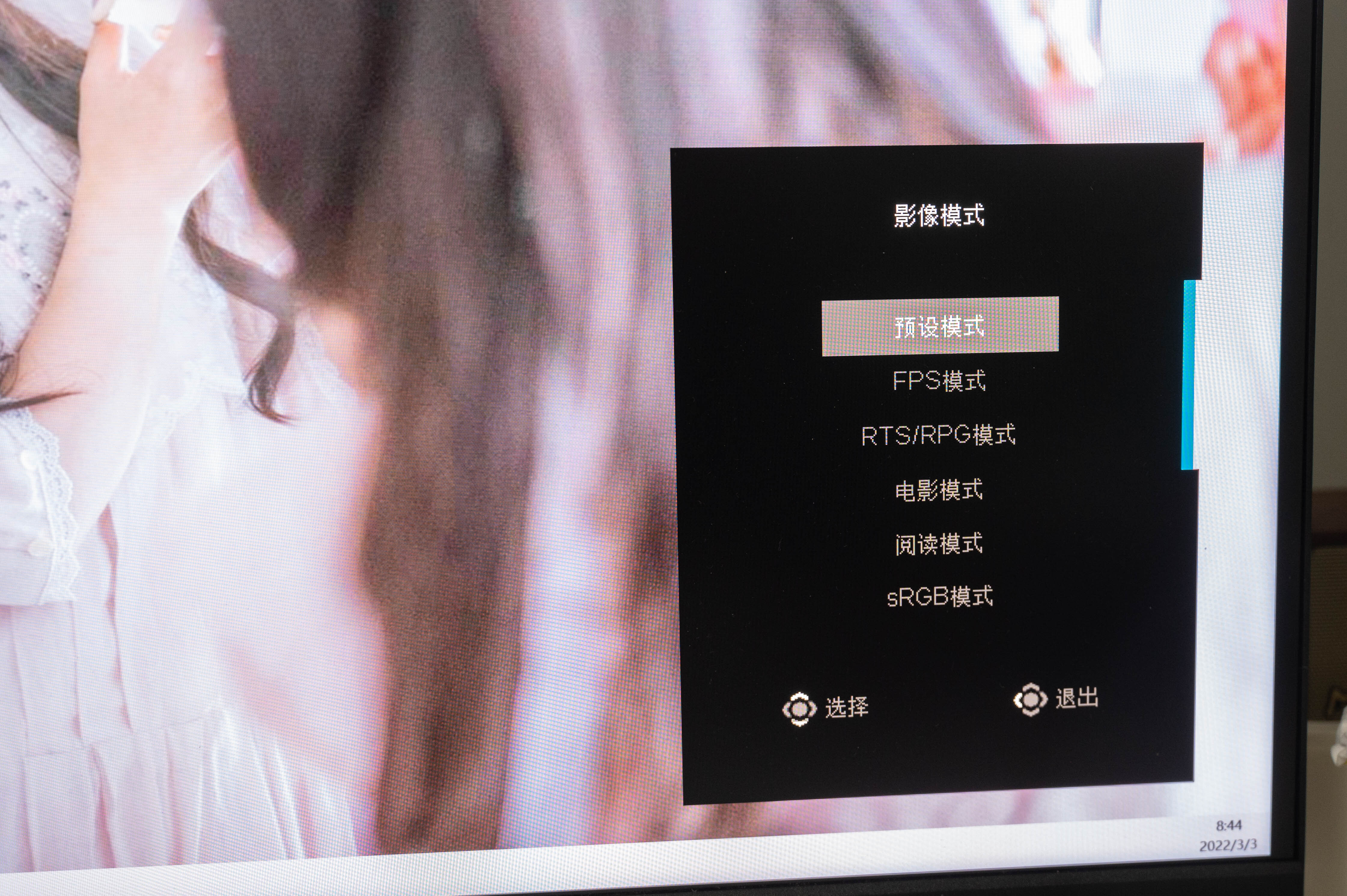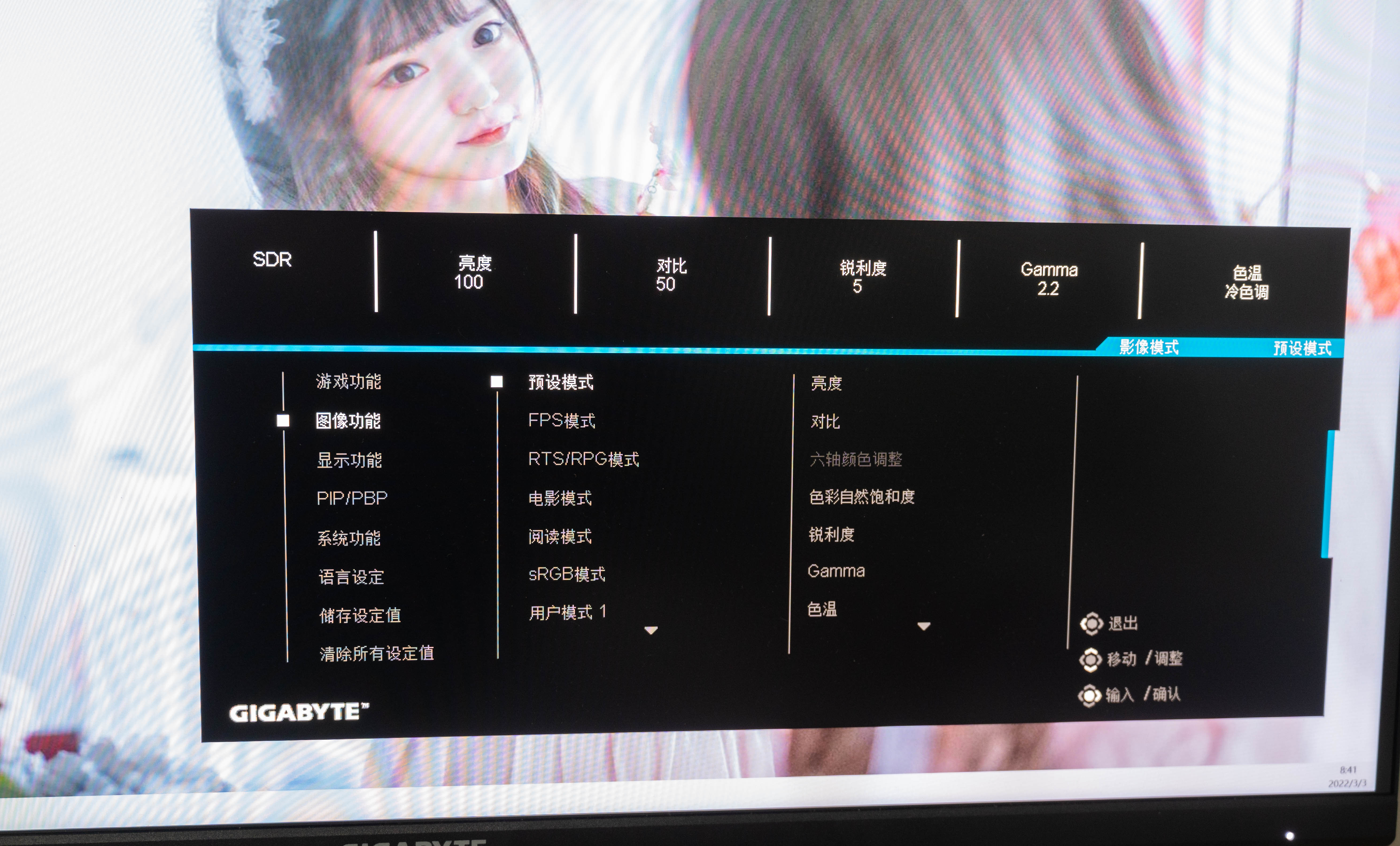 ▼通过技嘉M32U电竞显示器背后的5维导航键就可以进入设置菜单,在预设色彩上将FPS和RTS/RPG游戏进行分开,视频和文字阅读也分成电影和阅读模式,对于专业用户同样提供了sRGB的预设色彩调教。