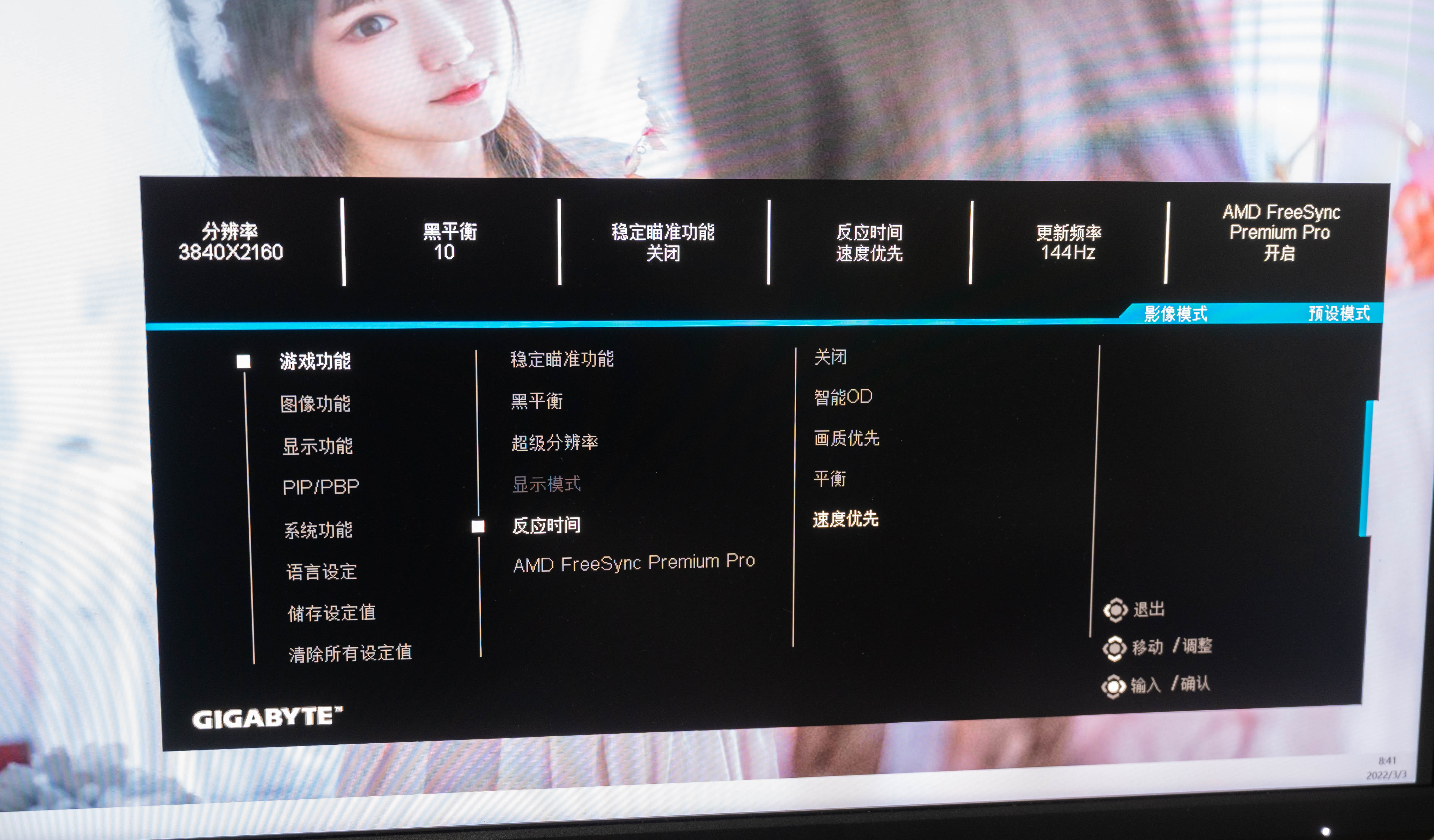 ▼除了基本的预设画面外,在OSD面板中还能调节面板反应时间等高阶参数,技嘉M32U电竞显示器支持Adaptive-Sync防撕裂技术,所以高帧率下同样可以保证画面顺滑。