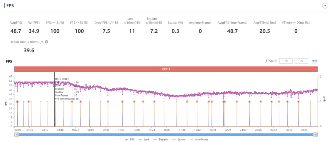 然后是天玑版本的帧率情况,同样在半小时的游玩时间里面,平均帧率去到了 48 帧,比骁龙 8 有个几帧的提升。不过值得注意的是,天玑版本的帧率是明显平稳不少,而且它是在前 6 分钟左右都可以维持满帧的运行,跟骁龙 8 的三分钟真男人,还是要坚持得更久一些。然后帧率也是逐步平稳下降到 55 帧、50 帧、45 帧左右。