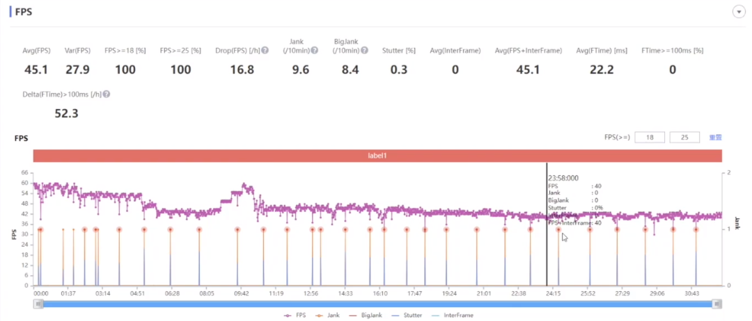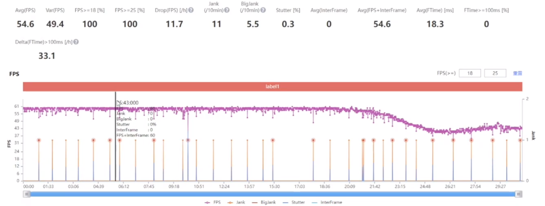 首先是骁龙 8 的帧率情况,在半个小时的游玩时间里面,平均帧率为 45 帧左右,在最开始的两三分钟里面它可以保持在 60 帧左右,但是很快就降到了 55 帧左右,大概 5 分钟后会平稳在 40 - 45 帧左右,可以看到帧率的波动还是比较明显的。中间有一分钟左右的帧率提升,其实那时候是我在爬山画面不需要做太多的运算,所以帧率升高了,但对整体平均帧率没有什么影响。