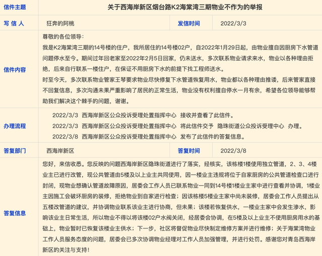 2022年3月3日,有一名网友在青岛政务网公开信箱留言反映K2海棠湾三期物业不作为的问题。