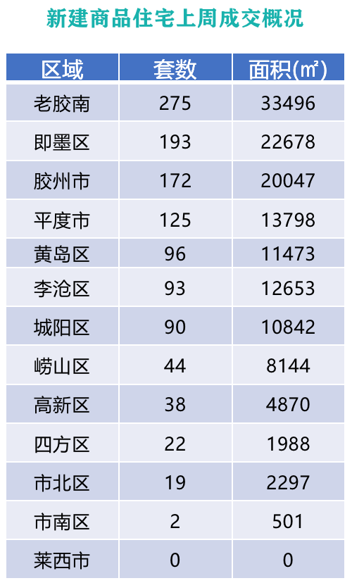 其它区域方面,远郊区平度市上周新房成交共计125套,新房总成交面积13798㎡,位列区域成交榜第四;黄岛区上周新房成交共计96套,总成交面积11473㎡;城阳区位列区域成交榜第七名,上周新房成交共计90套,新房总成交面积10842㎡;高新区上周成交新房38套共计4870㎡;莱西市受疫情影响,上周并无新房成交。