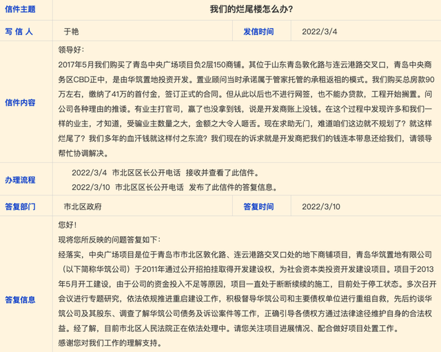 2022年3月10日,市北区政府对此做出了答复:经落实,中央广场项目是位于青岛市市北区敦化路、连云港路交叉口处的地下商铺项目,青岛华筑置地有限公司(以下简称华筑公司)于2011年通过公开招拍挂取得开发建设权,为社会资本类投资开发建设项目。项目于2013年5月开工建设,由于公司的资金投入不足等原因,项目一直处于断断续续的施工,目前处于停工状态。多次召开会议进行专题研究,依法依规推进重启建设工作,积极督导华筑公司和主要债权单位进行重组自救,先后约谈华筑公司及其股东、调查了解华筑公司债务及诉讼案件等工作,正确引导各债权方通过法律途径维护自身的合法权益。经了解,目前市北区人民法院正在依法处理中。请您关注项目进展情况、配合做好项目处置工作。