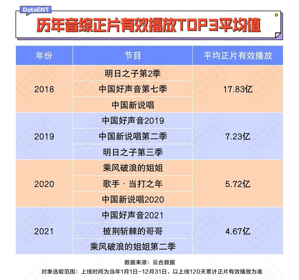 历年数据表示,音综上线期正片有效播放TOP3的平均播放量逐年走低,2021年相比2018年减少了四分之三。