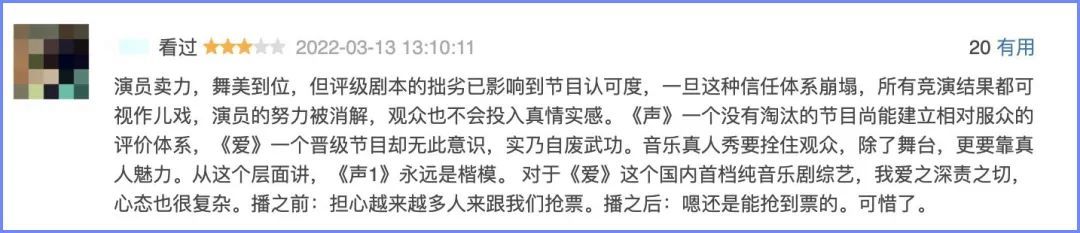 音乐剧元素的碰撞让它也难免被拿来和四年前的《声入人心》做比较,虽然表演从纯唱变成了唱演结合的舞台秀,形式更加丰富,但《爱乐之都》得到的反馈反而不及《声入人心》,也是值得节目组反思的问题。