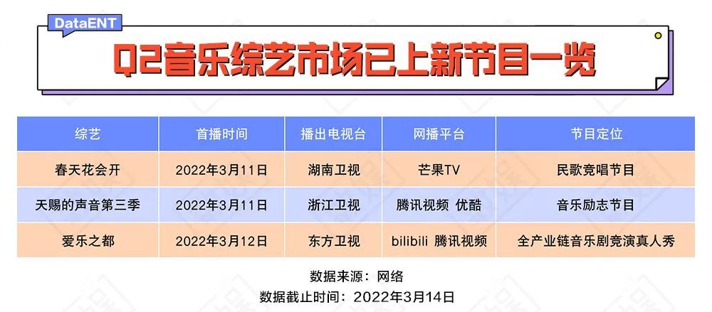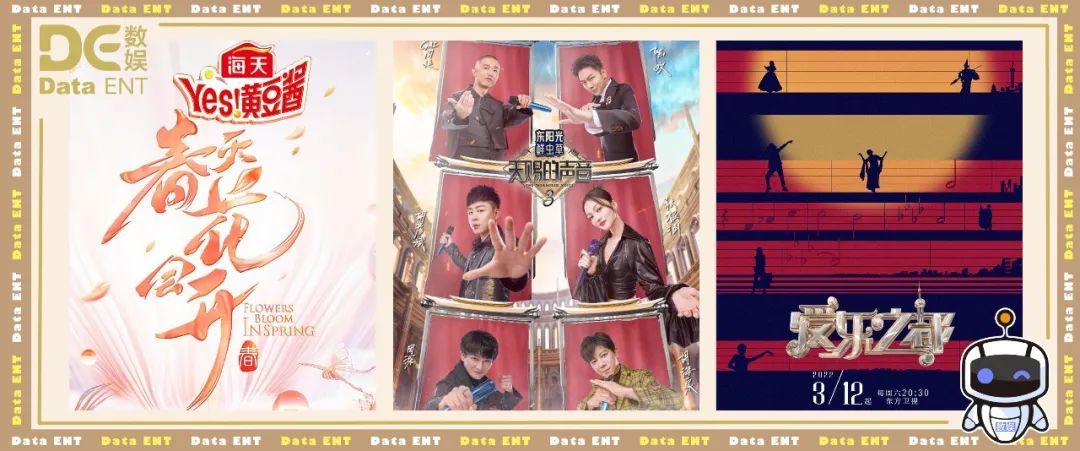 《天赐的声音第三季》沿袭了前两季的合作模式,演唱内容也以流行乐居多。另外两档节目从一开始就从音乐体裁上建立了差异化,选择了不那么大众的内容,《爱乐之都》是音乐剧竞演,《春天花会开》最初在片单公布的名字是《国风唱将》,体裁也是和曾用名对应的民歌。