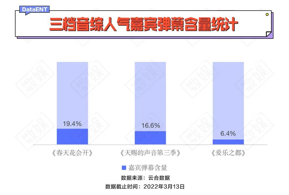 据云合数据弹幕统计,《春天花会开》里含有“华晨宇”和“花花”(华晨宇昵称)的弹幕占到了总弹幕量的近20%,《天赐的声音第三季》中,与周深相关的弹幕有9269条,是总弹幕量的16.6%,而在《爱乐之都》,和阿云嘎相关的弹幕量为1059条,为总弹幕的6.3%。