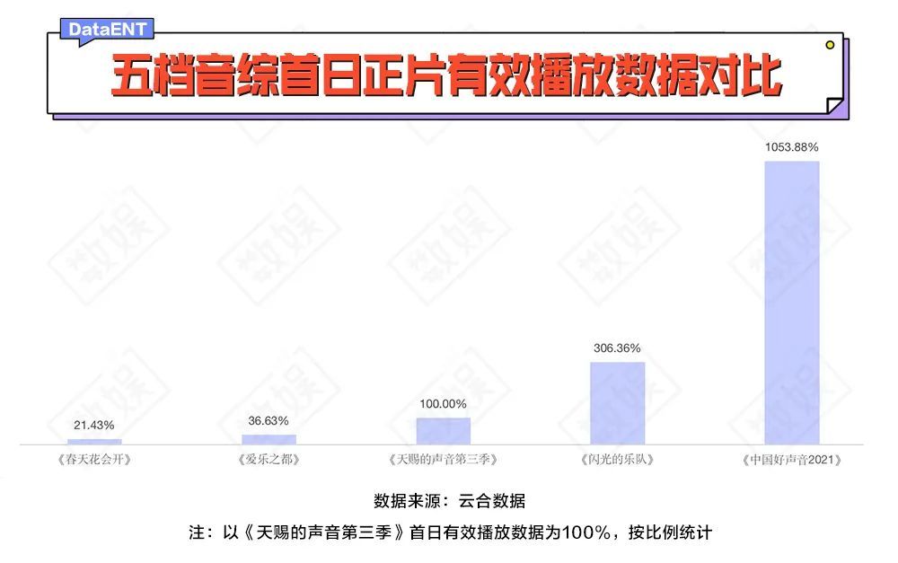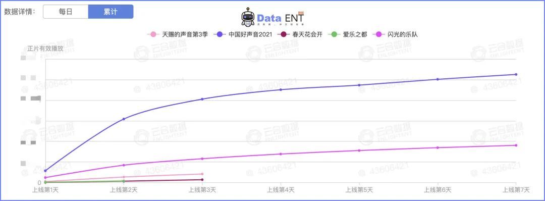 从数据来看,《天赐的声音第三季》的首日正片有效播放也是《春天花会开》的近四倍和《爱乐之都》的两倍多。