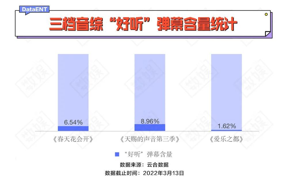 与此同时,在弹幕中搜索“好听”,三档节目的占比均未超过10%。