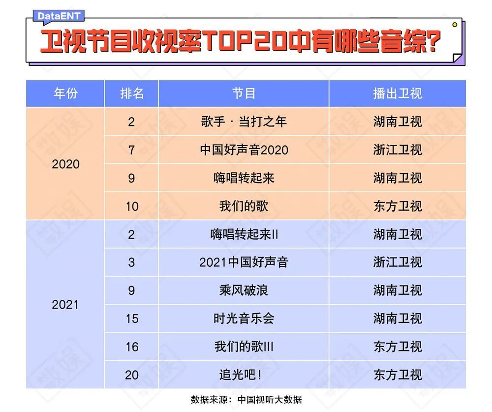 而在类型相对单一的电视综艺里,音乐综艺也因为容易获得高收视更加成为各卫视节目制作的重心。根据中国视听大数据统计的结果,2020年和2021年的卫视晚间综艺收视率TOP20中,音乐综艺的比例也分别为20%和30%。