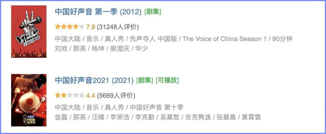 《中国好声音2021》在拿下去年音乐综艺网络播放第一的同时,也创造了自身的豆瓣评分新低,而《歌手》系列则在去年的《歌手·当打之年》之后正式宣告终结,伴随着车澈的离职,原定今年上线的《中国新说唱》全明星季最后效果如何尚待观察。