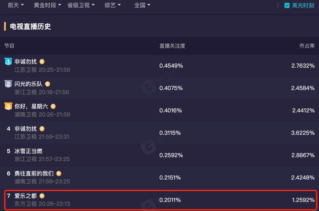 周六首播的《爱乐之都》相对落后,在同时段卫视节目中位居第七。
