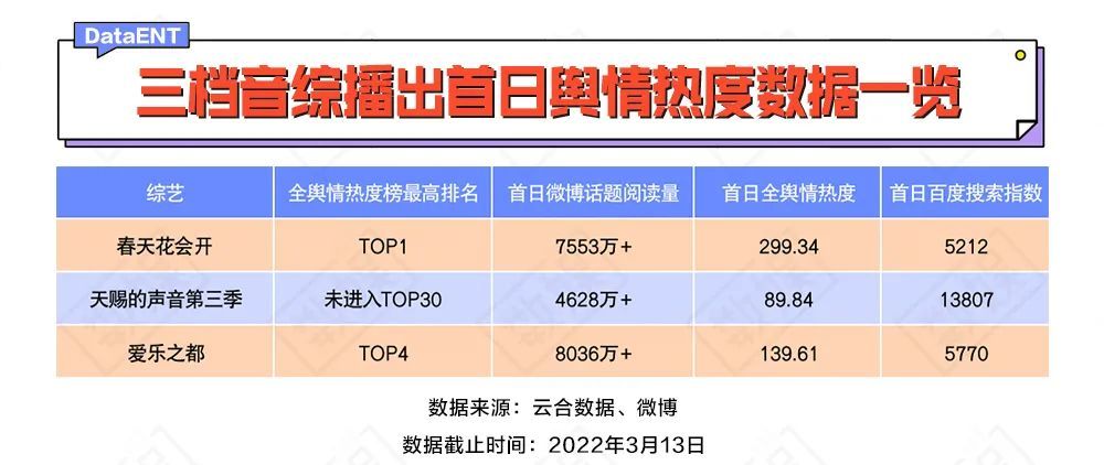 有前两季的基础在,它在播出首日便登上了云合数据电视综艺霸屏榜第7,次日升至第4位,而《春天花会开》在播出次日才冲到榜单第8,《爱乐之都》则在首日排在榜单第24位。