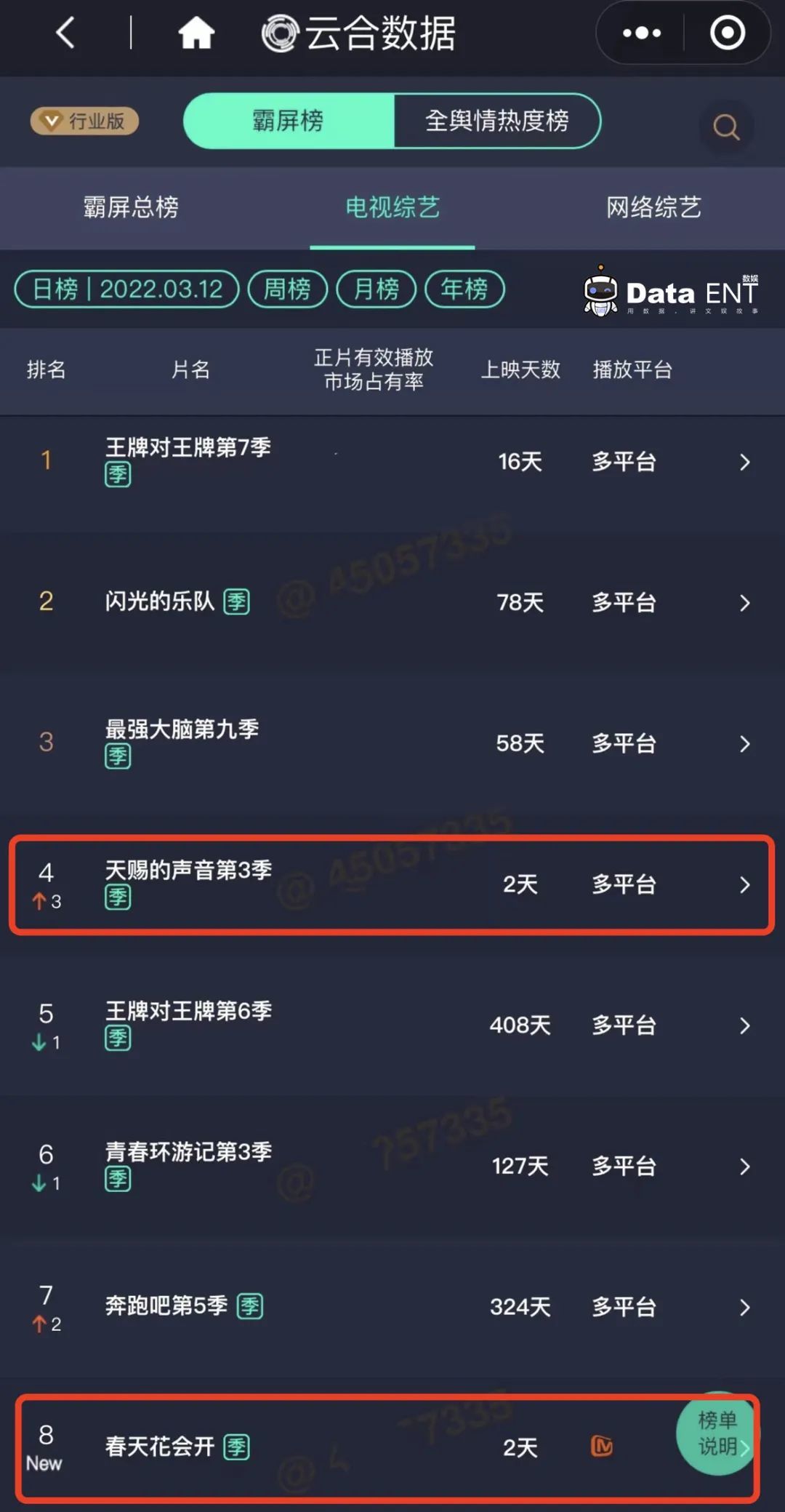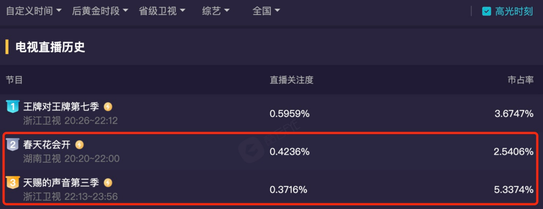 收视率方面,酷云数据显示,同一天播出的《春天花会开》和《天赐的声音第三季》分别位居同时段卫视节目第二和第三。