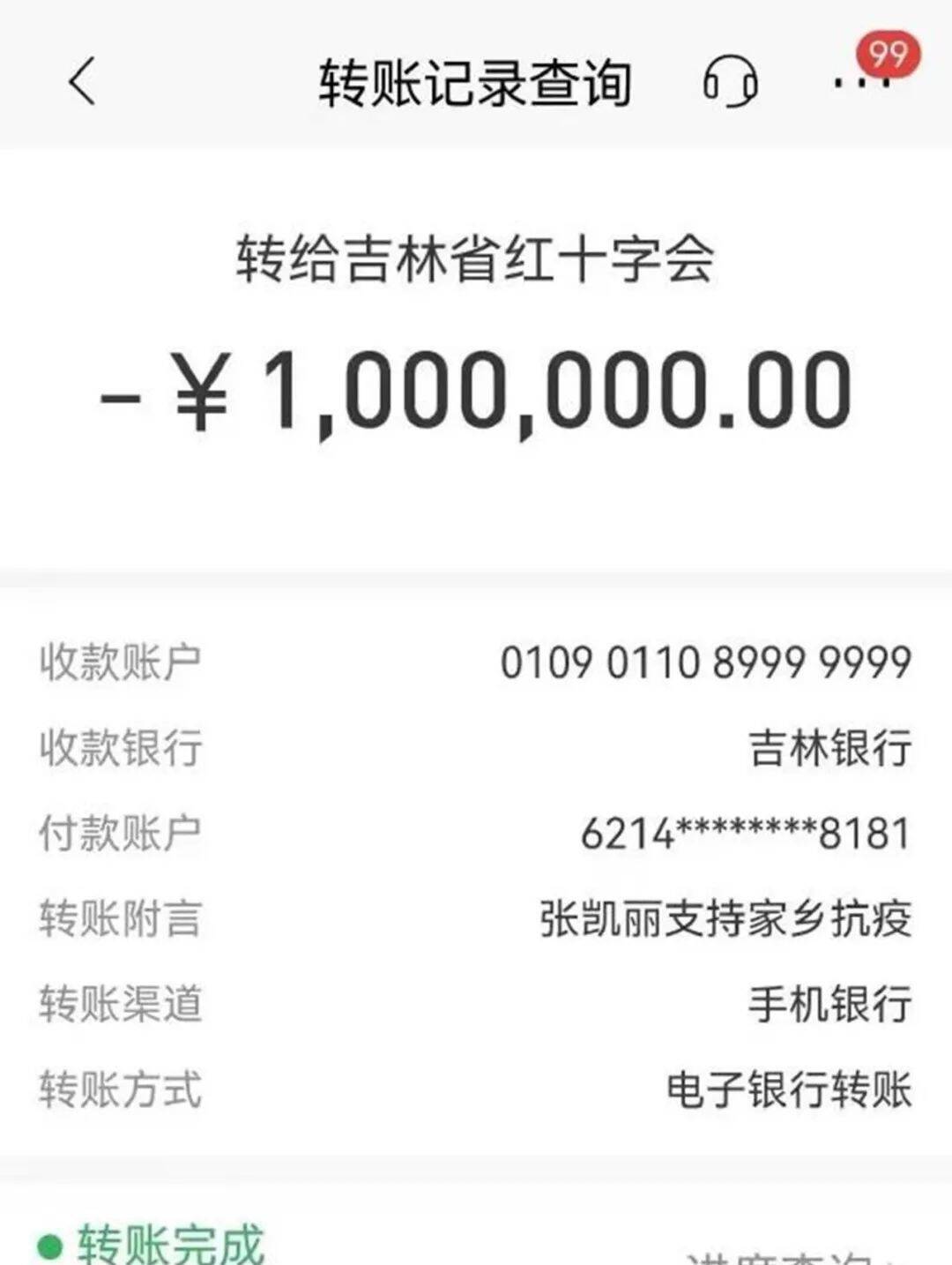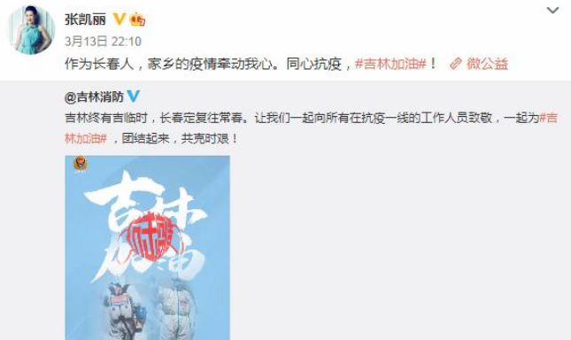 女演员张凯丽上了新闻,她通过银行转账向吉林省红十字会捐款100万,支援家乡吉林省疫情防控工作。