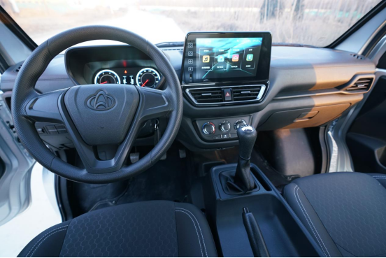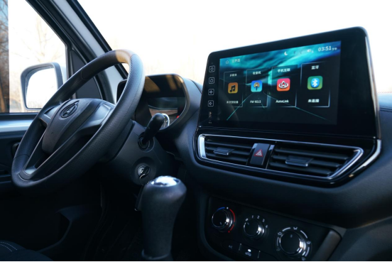 内饰颜色以大气沉稳的黑色为主,简约实用的按键布局,扎实精致的做工,让以往微卡的塑料感消失殆尽。中控搭载的10.2寸多媒体大屏,是整个驾驶室最吸引年轻用户的地方。中控搭配支持安卓、苹果手机的映射功能,一般轿车上搭载的高清倒车影像、倒车雷达等功能也是一应俱全,对新手上路非常友好。