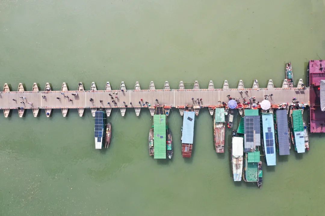 古浮桥始建于南宋时期,距今已有 800 多年,横跨于贡江之上,由 100 只船只相连而成。 桥头有各色商贩售卖,咸鱼是一定有的。