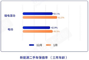 从保值率方面来看,今年1月新能源车保值率大幅提高,插电混动(PHEV)车型与电动(EV)车型三年车龄保值率分别提升至61.5%,49.5%。(注:保值率系二手车交易均价/新车指导价,新能源新车指导价按补贴前指导价参考。若无特殊标明,保值率均为三年期车龄保值率。)