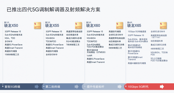 截止目前,5G正在全球范围内加速发展,预计2020年到2025年,一共5年的时间里,智能手机的出货量将超过50亿,这确实是个持续保持火热的市场。而作为5G研发、商用和规模化的中坚力量,高通也早于2016年就发布过首款5G基带骁龙X50、而后还有骁龙X55、骁龙X60、骁龙X65迭代升级,技术上的实力是越来越强。来到现在,骁龙X70特别引入了高通的5G AI套件,利用AI优化了各方面的能力,更满足了各大运营厂商的网络需求。