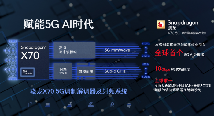 高通在MWC 2022世界移动通讯大会上,正式发布了旗下第五代5G调制借调器及射频系统——骁龙X70,它集成了全球首个AI处理器,能充分利用强大的AI能力实现突破性的5G性能和体验;同时,它也是全球唯一一个支持从600MHz到41GHz全部5G商用频段的调制解调器及射频系统,加上万兆级的10Gbps 5G传输速度,骁龙X70可以说是全面满足了全球运营商的定制和部署网络系统的能力。现在我们就来具体了解一下。