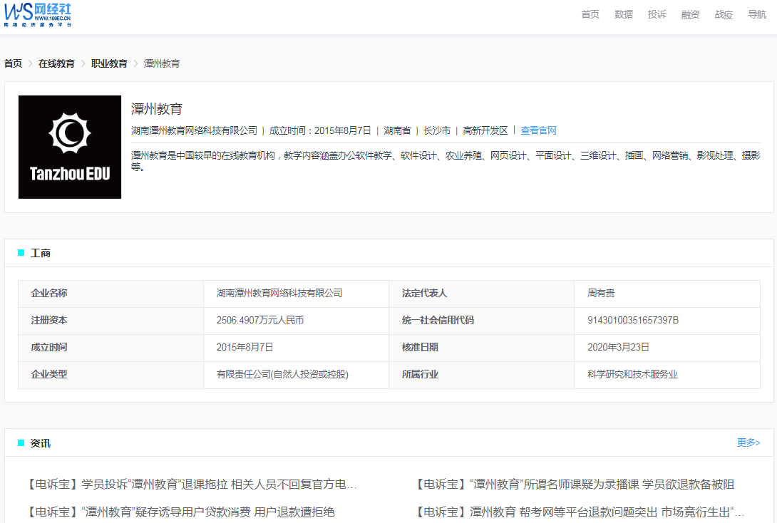 据网经社企业库(COP.100EC.CN)显示,“潭州教育”隶属于湖南潭州教育网络科技有限公司,法定代表人周有贵,作为在线教育机构,教学内容涵盖办公软件教学、软件设计、农业养殖、网页设计、平面设计、三维设计、插画、网络营销、影视处理、摄影等。