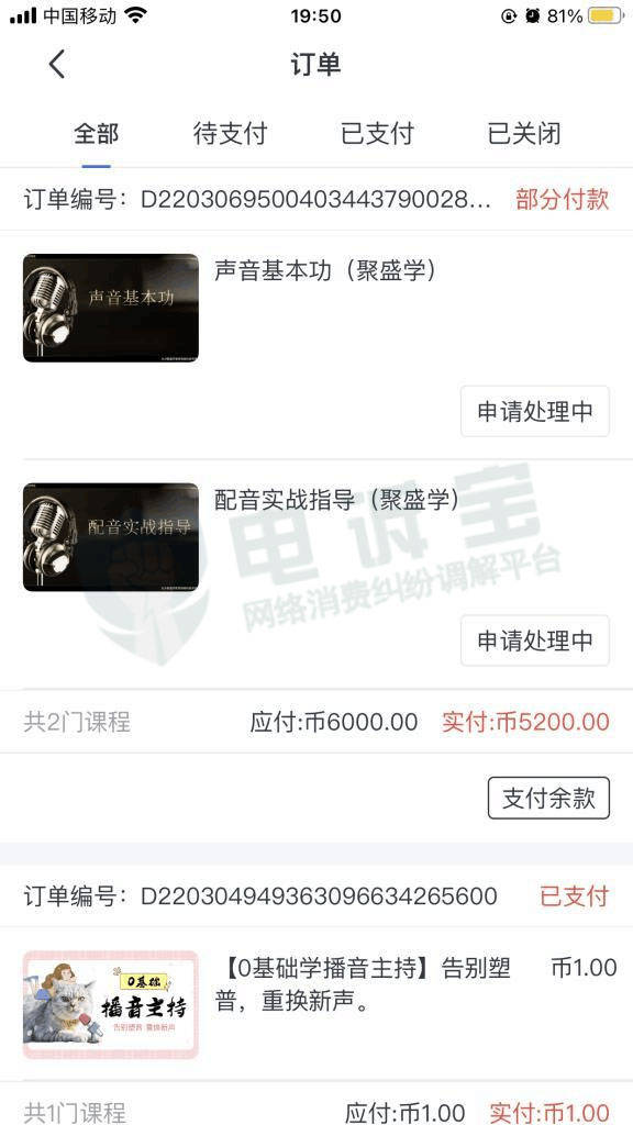 3月12日,四川省的雷女士向“电诉宝”投诉称其于2022年3月4日在微信公众号上看到学配音的兼职课程,3月6日当时花了一元钱报名听一节公开课,由静一老师讲课,课间有说明七天无理由退款,讲课快要结束时,老师推给一个二维码,让预交200元,可以成为vip会员,也可减免学费。