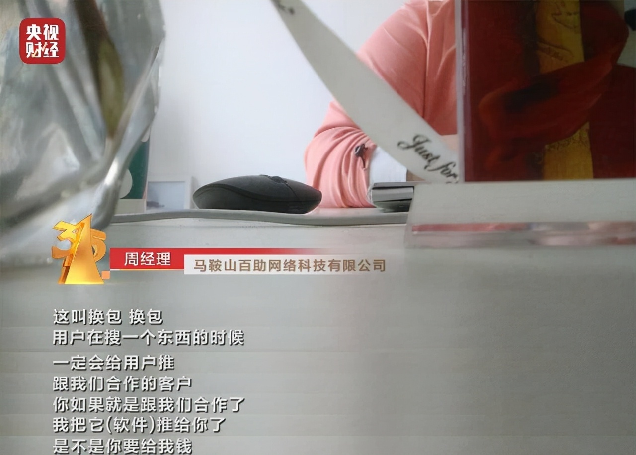 马鞍山百助网络科技有限公司 周经理:这叫换包,就是比方说用户在搜一个东西的时候,比方说想看视频,那作为我们合作的一个下载网站,我们会给用户推什么?一定会给用户推跟我们合作的客户,如果跟我们合作了,我把软件推给你了,是不是你要给我钱?