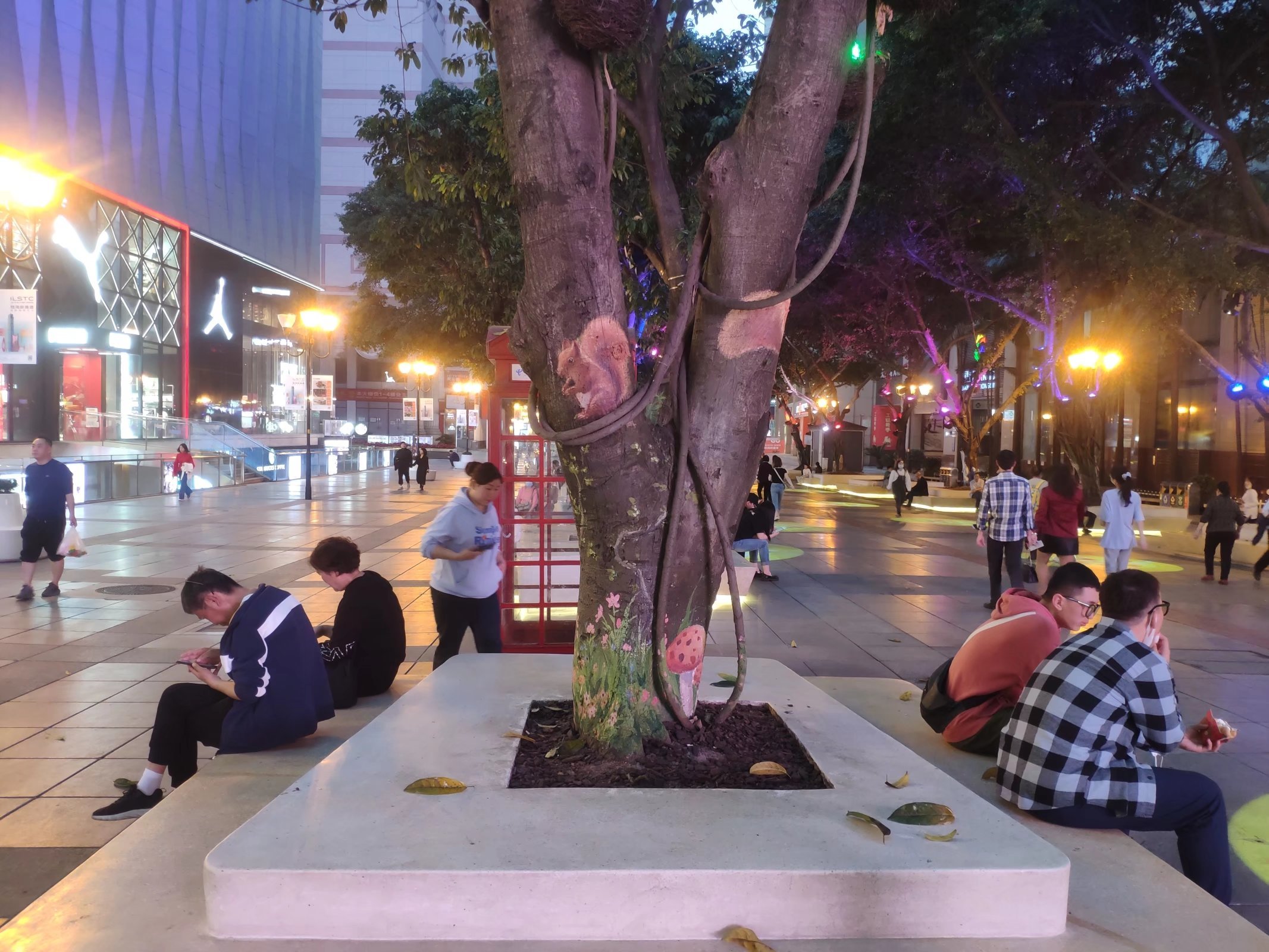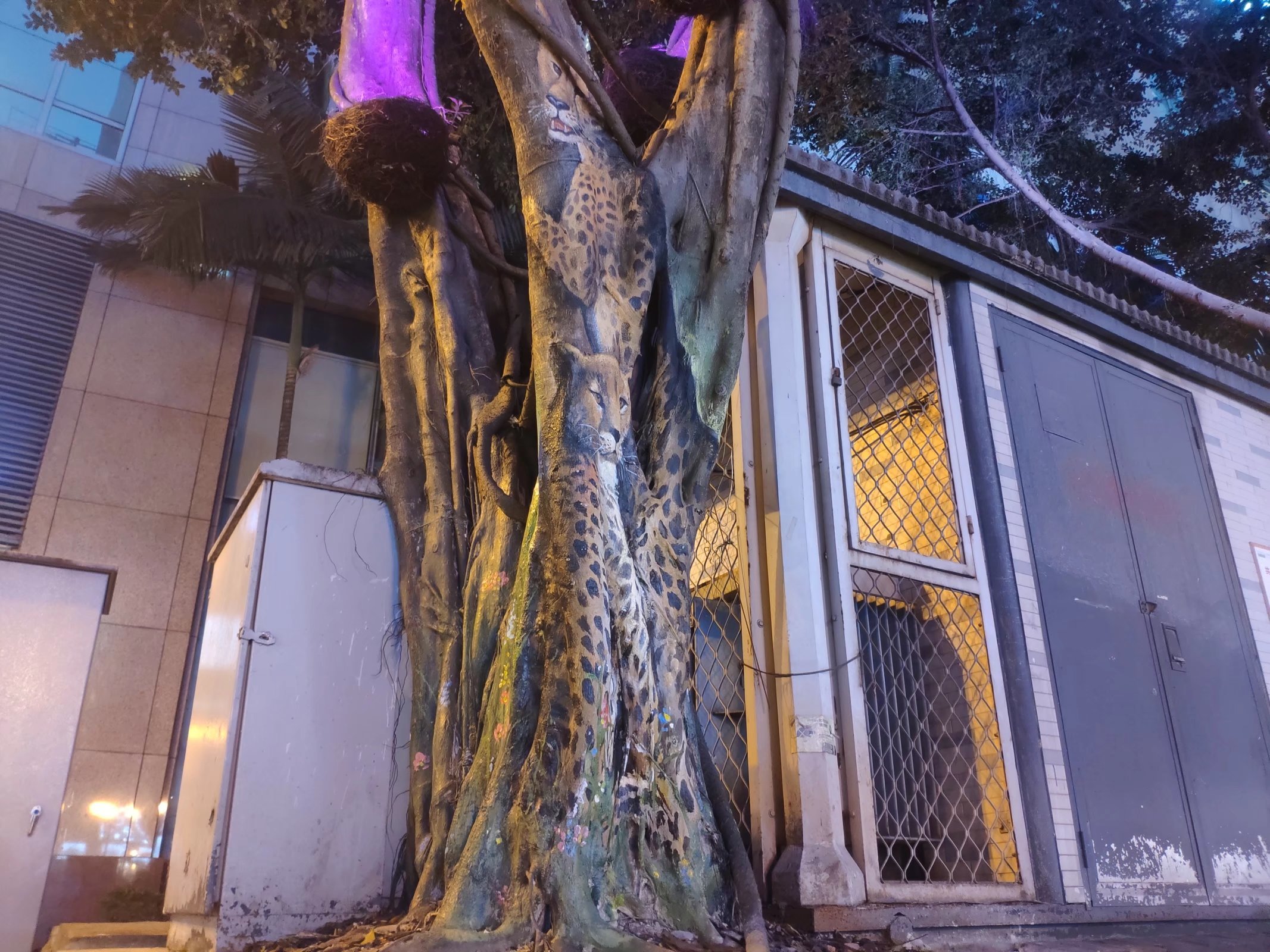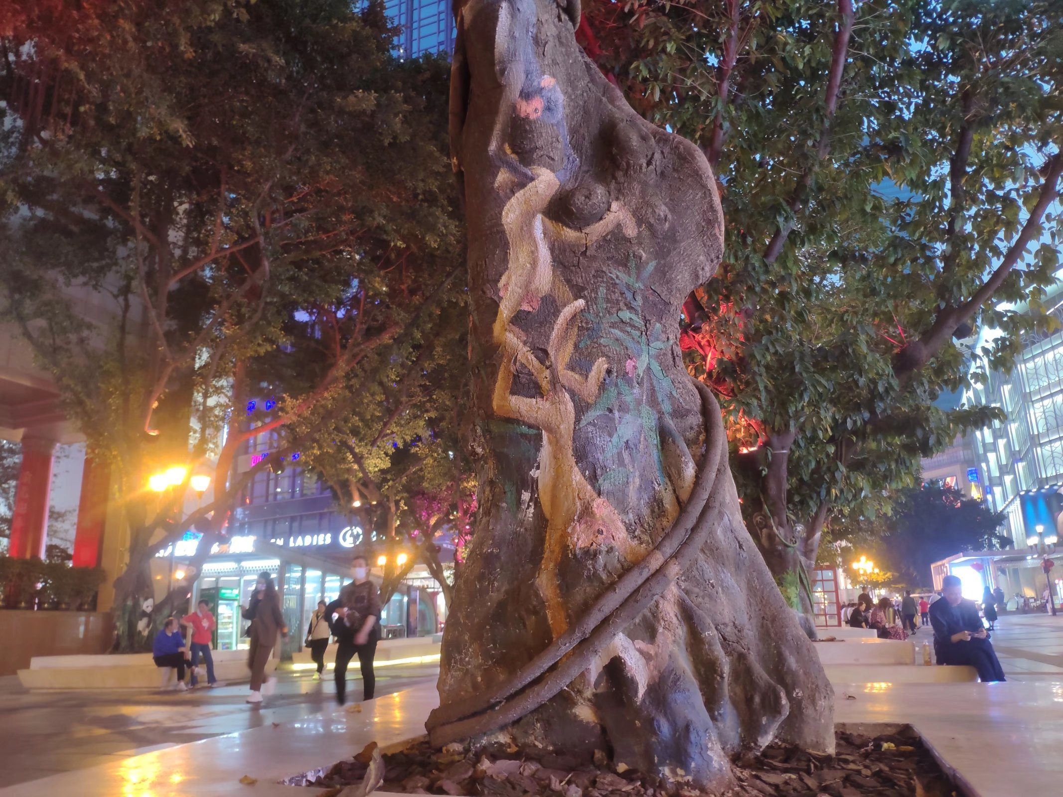 2022年3月15日,每个人的心中多多少少都怀揣着童话梦,童话里的世界如幻梦般浇灌着我们心灵。笔者在重庆市渝中区解放碑步行街看到,一个个憨态可掬、灵气逼人的小动物不知不觉“爬上”两旁的黄桷树,仿如童话里的动物走出树外,照亮现实。栩栩如生的“萌宠”与闹市相映成趣,使得游客们纷纷前来合影留念。只见每一棵大树都根据树干形状绘制有不同的动物,有长颈鹿、大熊猫、孔雀、大象和猴子,还有《疯狂动物城》里的“闪电”树懒、《狮子王》里的“丁满”狐獴等十多种动物。“这些彩绘很漂亮,它们让解放碑生机盎然。都是树绘创作者结合树体形态巧妙绘制而成,给原本单调的行道树增添不少趣味,变为生趣盎然的“动物森林”。