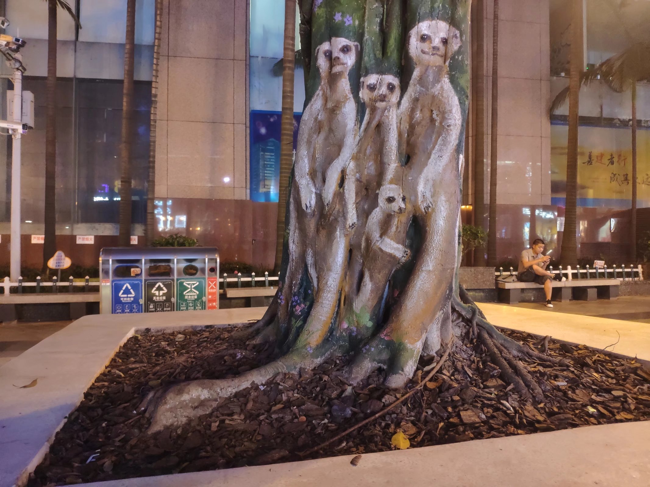 在重庆市渝中区解放碑步行街看到,一个个憨态可掬、灵气逼人的小动物不知不觉“爬上”两旁的黄桷树,仿如童话里的动物走出树外,照亮现实。栩栩如生的“萌宠”与闹市相映成趣,使得游客们纷纷前来合影留念。