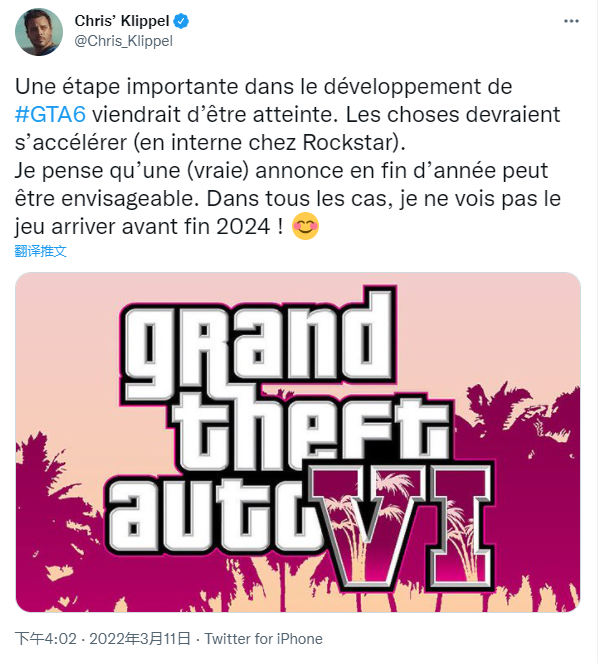 Klippel,表示,《GTA 6》预计将在年底获得官方宣布,游戏正式上市时间为 2024 年底或 2025 年初发布。