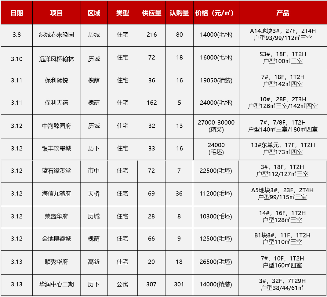 乐居买房讯 3月8日-3月13日,济南共有12个项目推出新房源,多数为顺销推出,其中历城区4盘、槐荫区3盘、历下区2盘、高新区1盘、市中区1盘、天桥区1盘,分别是绿城春来晓园、远洋凤栖翰林、保利熙悦、保利天禧、中海臻园府、银丰玖玺城、蓝石缘溪堂、海信九麓府、荣盛华府、金地博睿城、颖秀华府、华润中心二期。