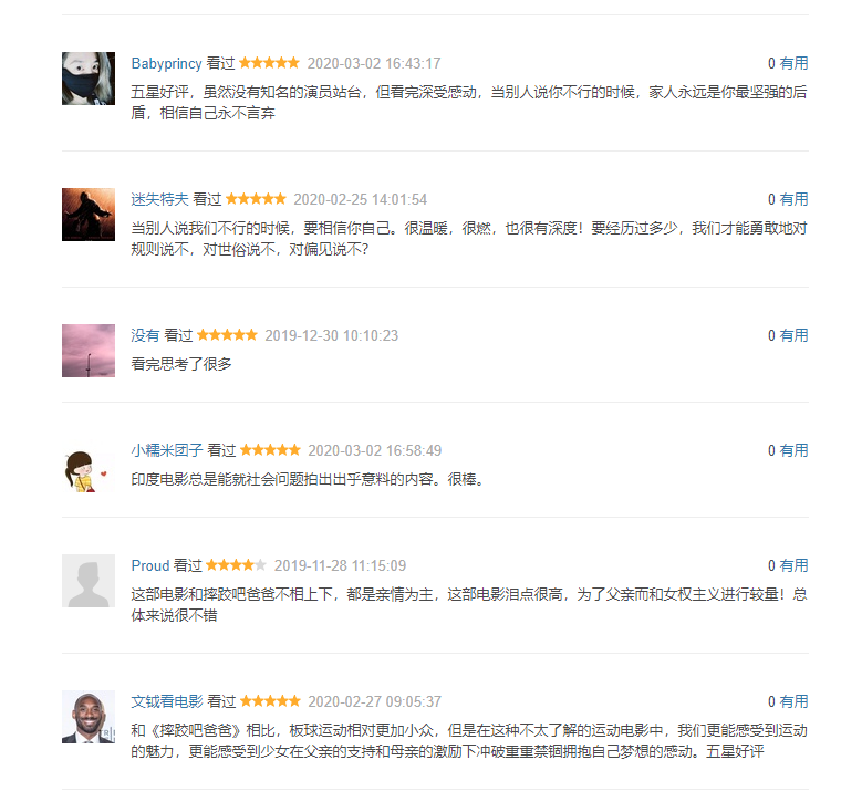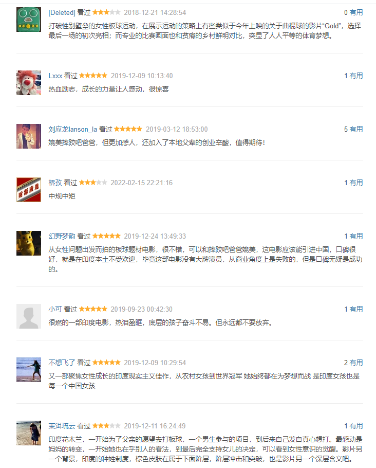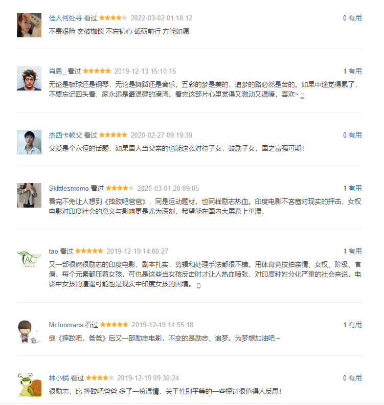 “真好,和摔跤爸爸不相上下,可以说是更燃,深刻探讨了印度的女权和阶层问题,表达节奏也好。”