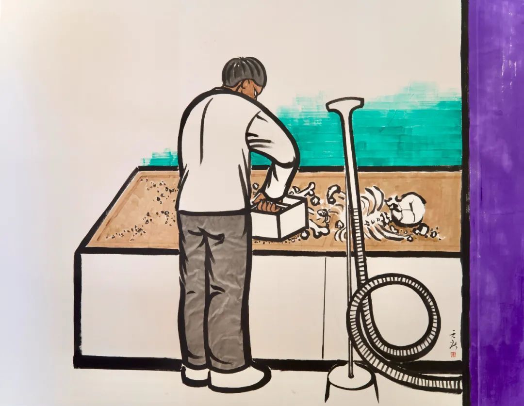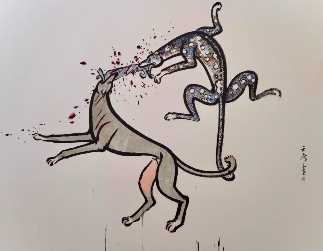 展览以一种直截了当的行事风格和极简主义的展陈方式呈现了艺术家十幅水墨画新作,和手工书《苦海》中记载「杨镇斗狗」的书籍内页。这批宣纸水墨画描绘的内容一为「斗狗」一为「焚尸」,均取材自仝天庆的手工书《苦海》中的插图。令人毛骨悚然的禁忌主题,如何在艺术世界中被合理接纳?通过将它们加以「美化」,仝天庆的水墨实践具备了当代性。他恰如其分地挥舞毛笔,并呼应着与之紧密相关的历史,将杨镇大集的围观冲动转译到看似违和的商业画廊。通过此举,仝天庆提醒我们,墙面上的众人与你我并无分别。