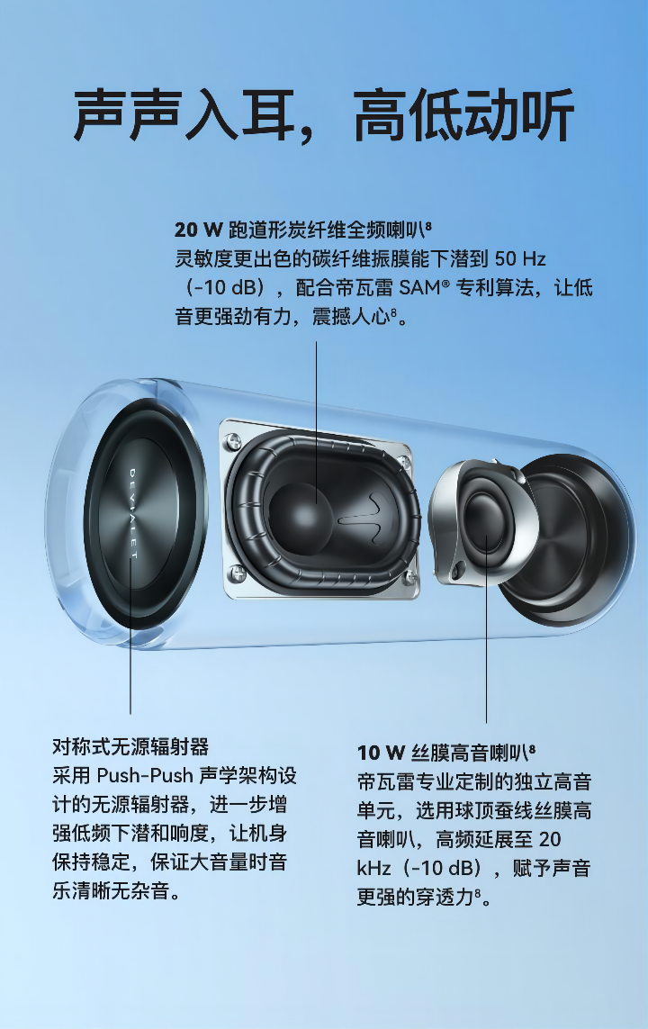 此次发布的华为 Sound Joy更是与专业音响品牌帝瓦雷联合设计,采用了帝瓦雷四单元二分频架构,拥有1个峰值功率10W的高频喇叭(19mm)、一个峰值功率20W的全频跑道形喇叭(50mm*75mm)和2个无源辐射器,两个喇叭一个负责高音,一个负责中低音,各司其职,工作在各自最擅长的频率区域内,再配合上帝瓦雷独有的SAM®技术,主动控制喇叭的振动,提升低频的瞬态响应,减小失真,复原出更多细节,让高音宏亮而不燥,低音厚而不闷,发音强而有力,音量大而传远。
