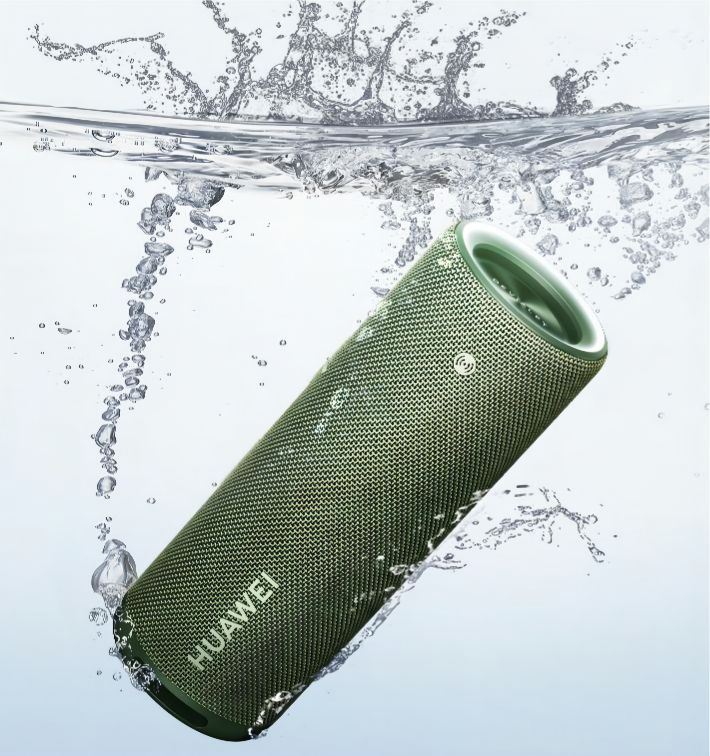 整机侧面全部由紧绷的透气织物包裹,织物由涤纶和棉纶两种材料横竖梭织而成,采用了双色双染工艺,两种颜色两种光泽相辅相成,呈现了丰富的层次和细腻的手感,并且华为 Sound Joy还具备IP67级别防尘防水,无论是户外阴雨天还是室内泳池,都能自如使用。