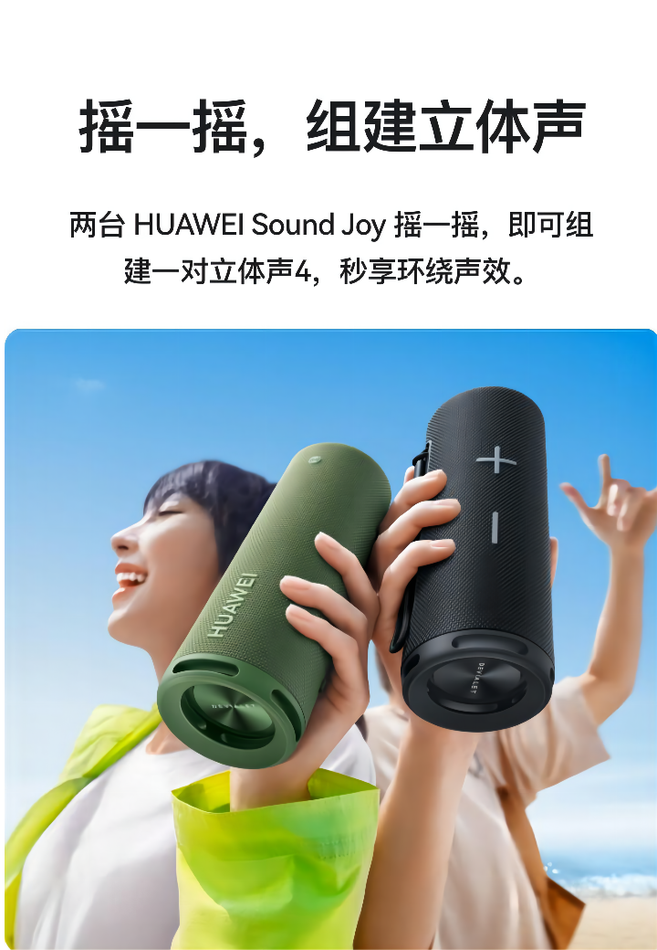 华为 Sound Joy作为一款兼具智能的音箱,语音交互、语音指令只是其最基础的功能,HarmonyOS的加持,赋予了它万物互联的能力,当用户持有两台华为 Sound Joy时,只需要通过摇一摇的方式,即可快速组建立体声,让你在音影娱乐时享受美妙的环绕音效,华为 Sound Joy最多可支持100台串联,真正做到让声音在每一个角落响起。