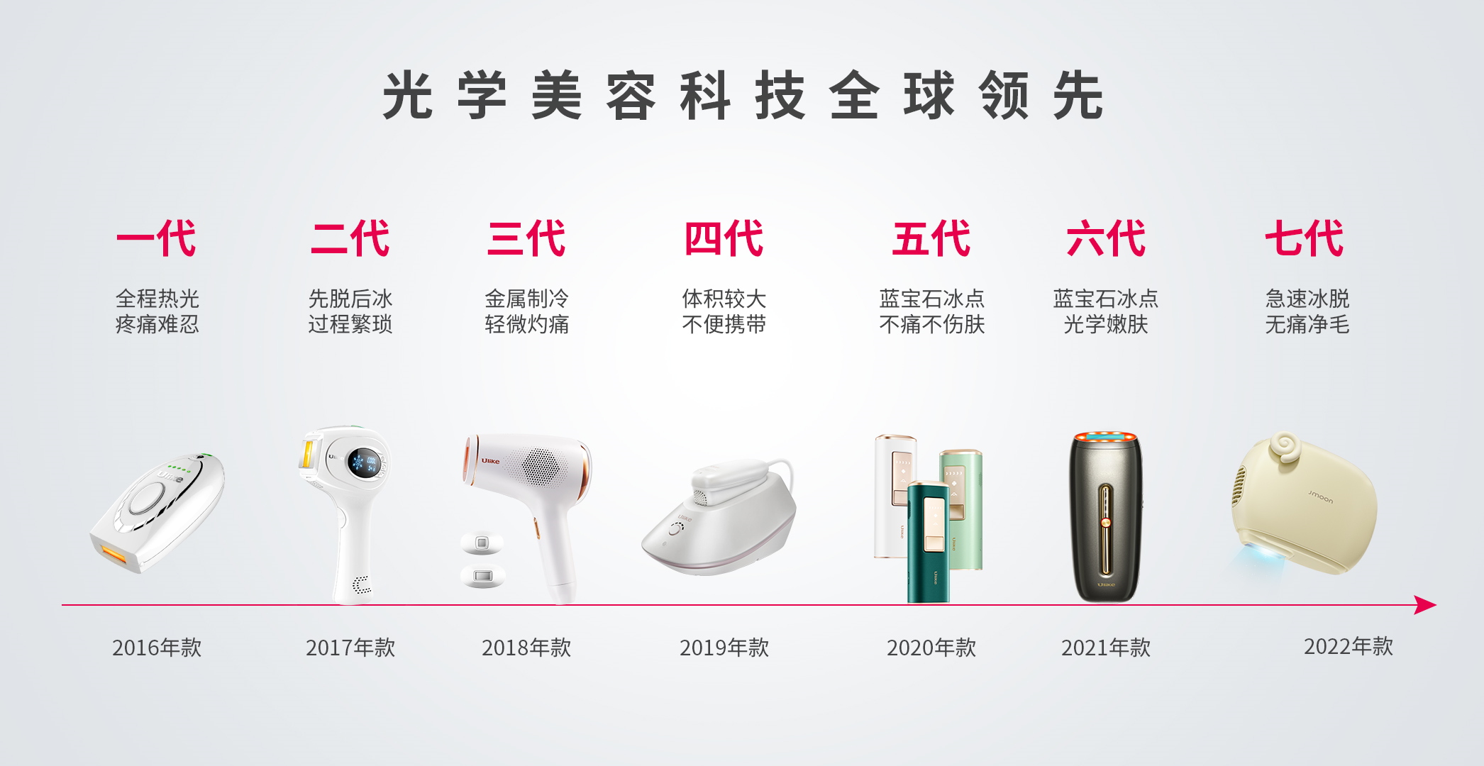 但罗马城不是一天建成的,Ulike 家用脱毛产品经过了七年七次迭代,技术上不断精益求精,方才从初代热光脱毛产品逐渐升级到今天的无痛冰点脱毛黑科技。