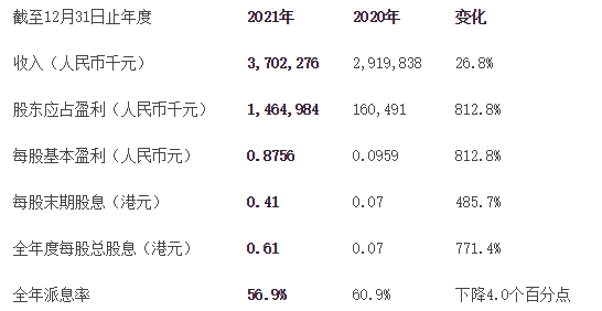 董事会建议派发2021年末期股息每股0.41港元,连同已派发之中期股息每股0.20港元,2021年度的股息总额为每股0.61港元,相当于人民币0.4980元,全年派息率相当于56.9%。本次的股息派发考虑了集团一贯以来实时与股东分享经营成果,符合集团的派息政策,有效平衡财务安全以及保持集团的发展后劲,为股东创造更好的回报。