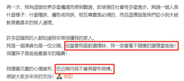 并且,立威廉还在文中是对这个世界还有这么多肤浅的人感到难过,不管容貌或肤色都应该互相尊重,这是做人的基本道理,也说在演员与父亲之间会毫不犹豫的选择当一个父亲,所以为了保护家人,他宣布在近期内不会再发布微博。