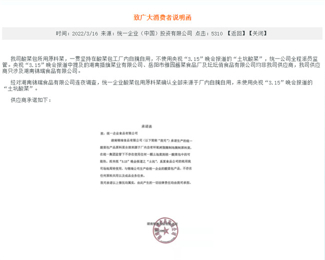当天,统一在最新的声明中表示,公司未使用“土坑酸菜”。经对湖南锦瑞食品的连夜调查,统一企业酸菜包用原料菜确认全部来源于厂内自腌自用,未使用央视“3.15”晚会报道的“土坑酸菜”。同时,在声明中附上湖南锦瑞食品的承诺函。