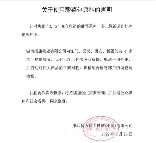 3月16日,康师傅再度发布声明,表示湖南插旗菜业向江门、武汉、西安、新疆共4家工厂提供酸菜,公司已终止其供应商资格,取消一切合作,并启动对相关产品的下架回收处理。