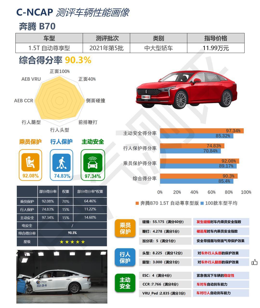 都说碰撞测试中得了五星十分安全,但是五星中也有优胜劣汰,在近一年的C-NCAP测试过的五星安全车型中,第三代奔腾B70以唯一超过90%得分率位居第一,甚至超过了很多合资品牌车型!