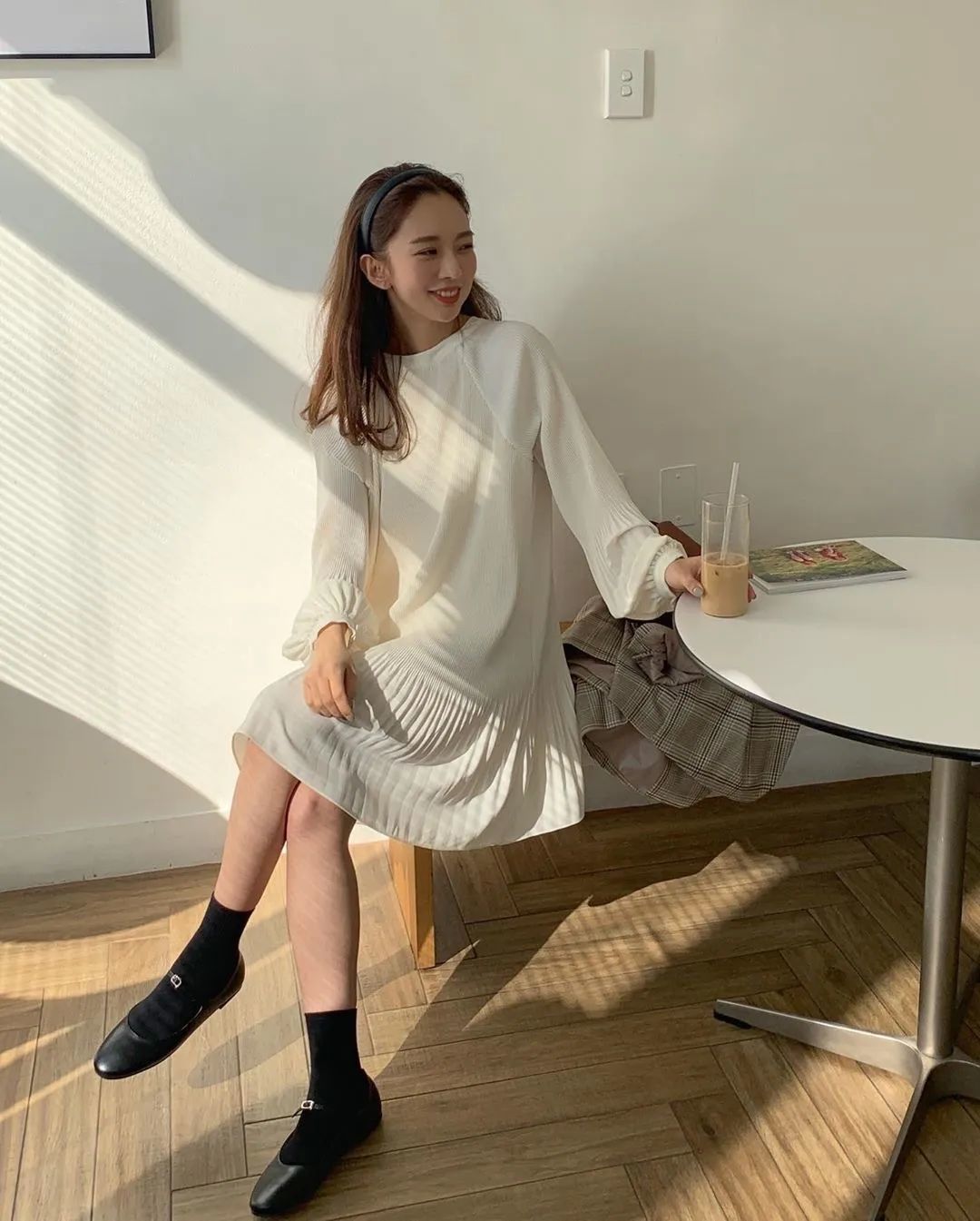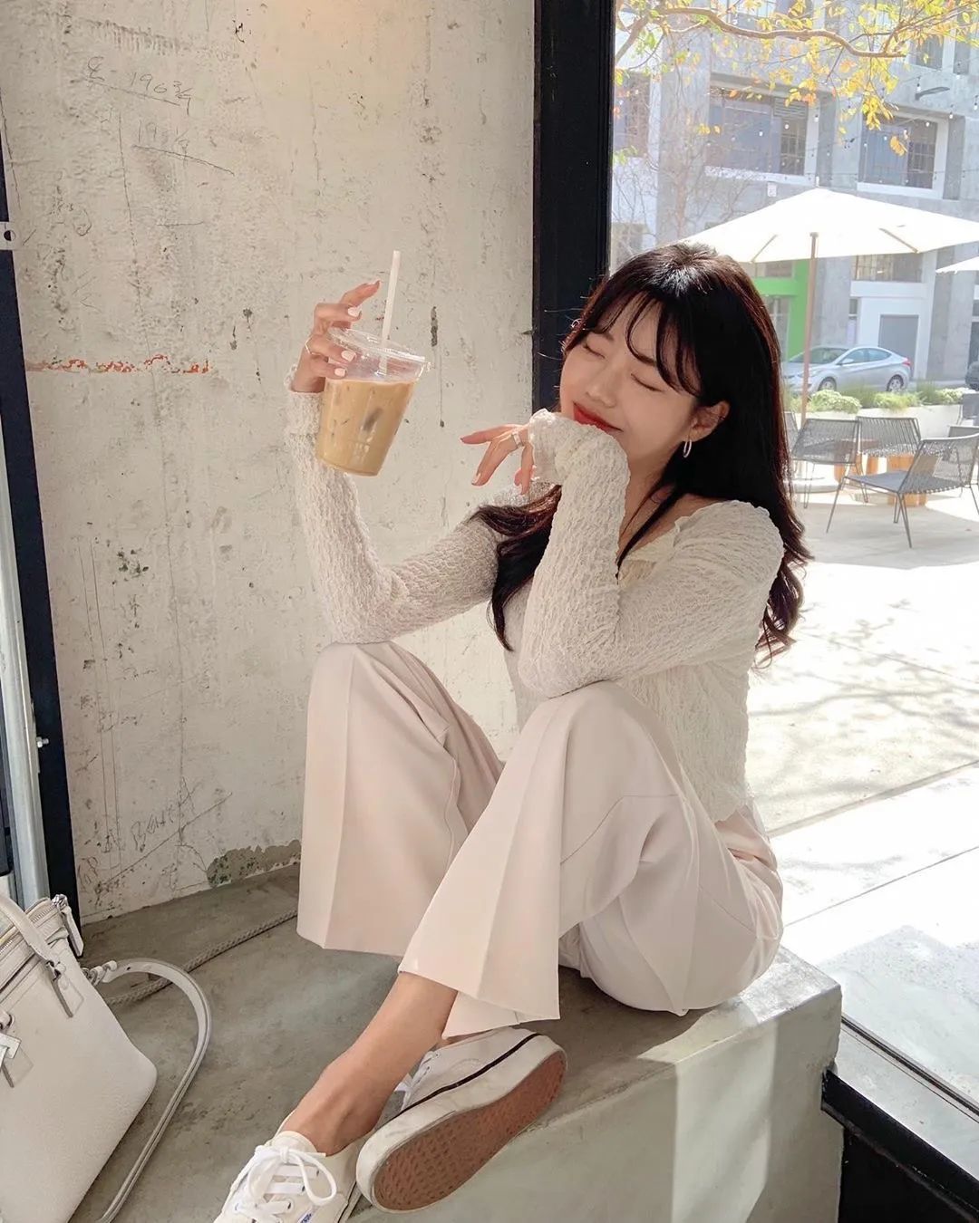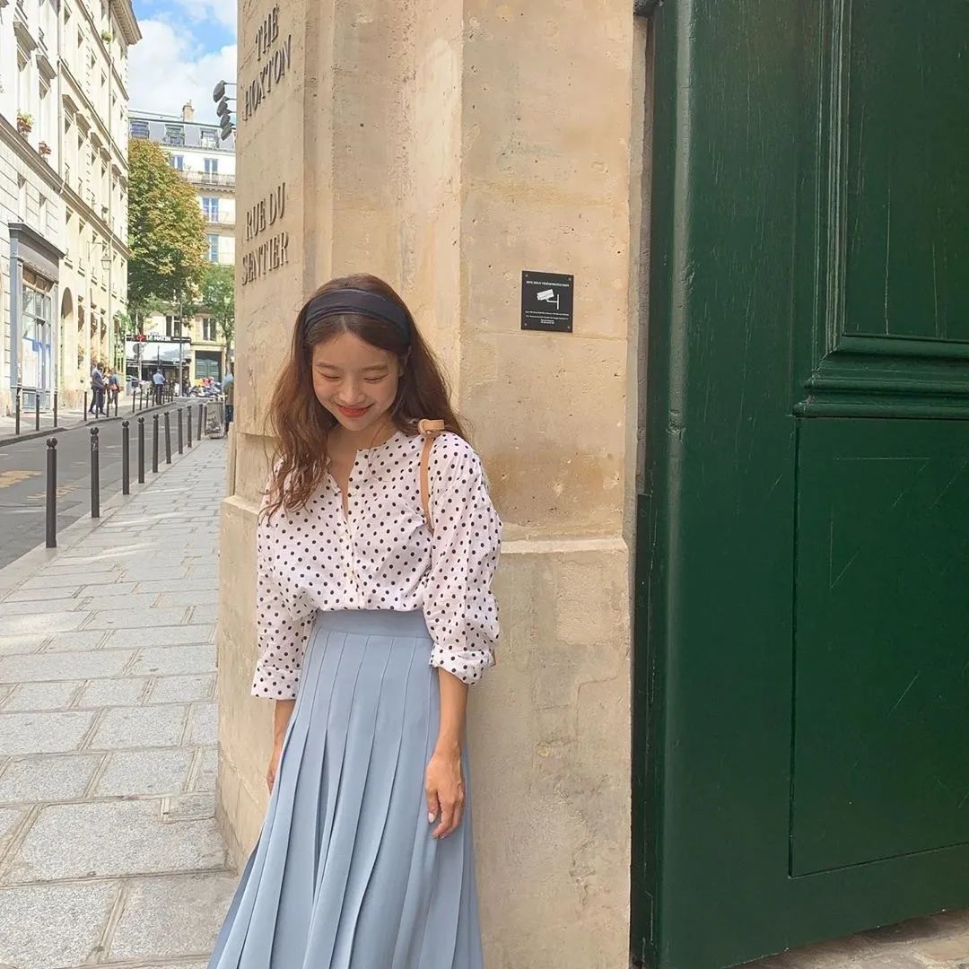 想要穿出甜美的感觉,只靠黑白灰的基础色很难做到,但是加入轻盈的浅色系,就能让人眼前一亮。