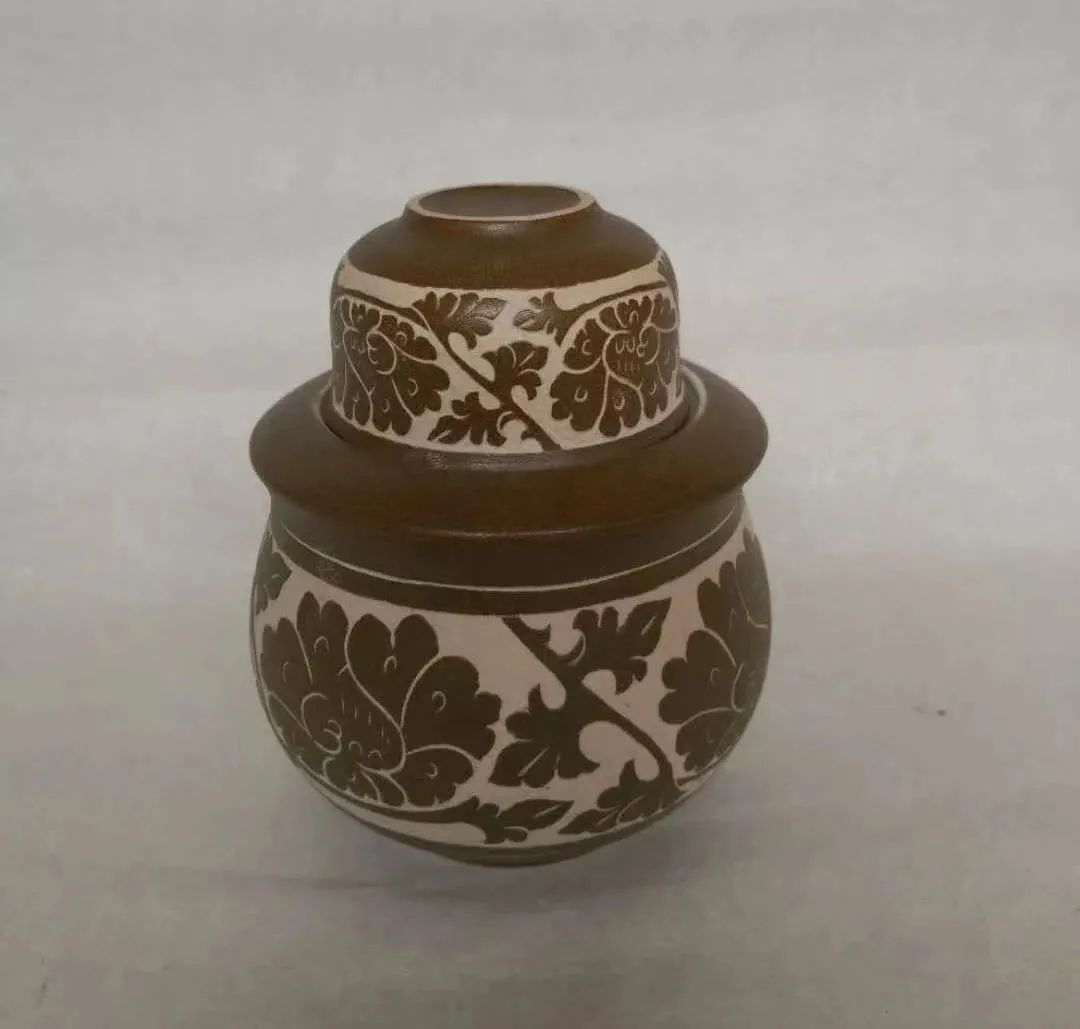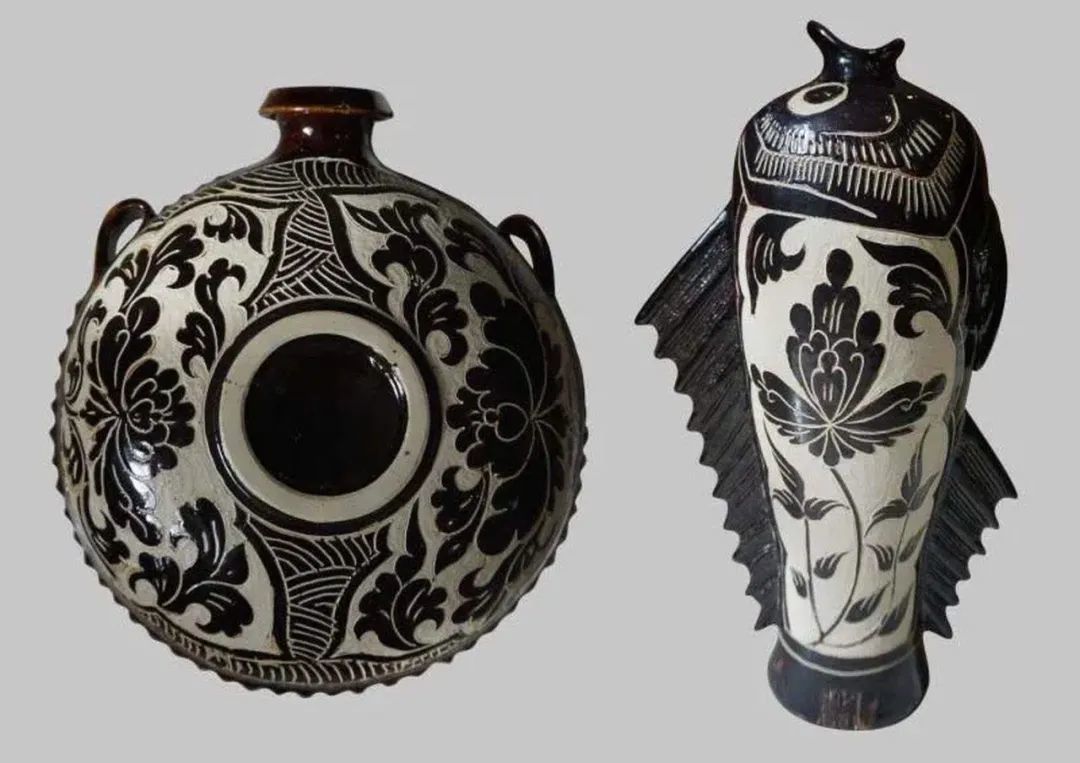 西夏瓷器,有白釉画花及黑、褐、绿、黄釉剔花等,色彩对比感极强。种类主要有瓮、罐、瓶、碗、盘、碟钵、尊、盆、扁壶等,装饰多以花鸟、天鹅、鸭等禽类和花卉为主。其中,剔花瓷挂釉后,勾画纹饰,剔刻去花纹以外的釉,露出白色胎底,黑白鲜明、构图新颖、线条流畅、刀法明快,且讲究对称,布局严谨,形成了深浅色彩的强烈反差,增强了整体构图美感,具有较高的实用价值和艺术价值。