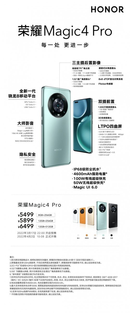 3月17日22 : 00,各授权门店开启预售!3月25日 10:08 荣耀Magic4正式开售 ,4月2日 10:08 荣耀Magic4 Pro正式开售,荣耀Magic4 至臻版将于4月开售,敬请期待!欢迎前往广东荣耀线下门店进行选购!!