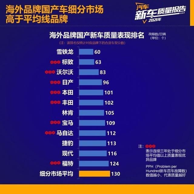当前的汽车市场飞速发展,有关新车质量的问题层出不穷。据3月15日汽车之JIA发布的《2021年乘用车新车质量报告》数据显示,2021年汽车行业新车总体质量PPH(新车百车故障数)平均数值为135,对比2020年的156出现了下降(即质量表现提升)。在“海外品牌国产新车质量表现排名”中,雪铁龙以国产新车故障率最低(PPH值仅为60),且低于细分市场平均值一半的表现,获得“海外品牌国产新车质量表现排名第一”;标致也以非常接近的表现荣获第二,并且连续三年质量表现均居于细分市场平均值以上。