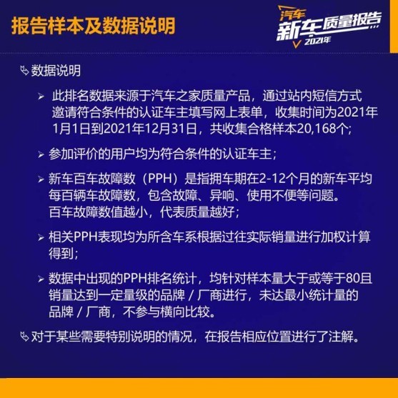 据了解,汽车之JIA乘用车新车质量报告诞生于2014年,并于2015年首次发布结果。汽车之家质量评价是基于真实车主对于拥车期2-12个月内车辆质量情况的调研,通过汽车行业内通用的计算方法和标准分析评定汽车质量情况的产品。其中新车百车故障数(PPH)是指拥车期在2-12个月的新车平均每百辆车故障数,包含故障、异响、使用不便等问题。百车故障数值越小,代表质量越好。