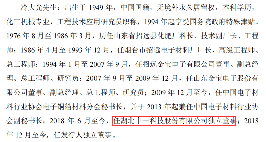 据招股书显示冷大光为公司独立董事但身兼数职2009 年 12 月至今,任中国电子材 料行业协会电子铜箔材料分会秘书长,并于 2013 年起兼任中国电子材料行业协 会副秘书长;2018 年 6 月至今,同时在任同行业湖北中一科技股份有限公司独立董事;2018 年 12 月至今,任发行人独立董事。
