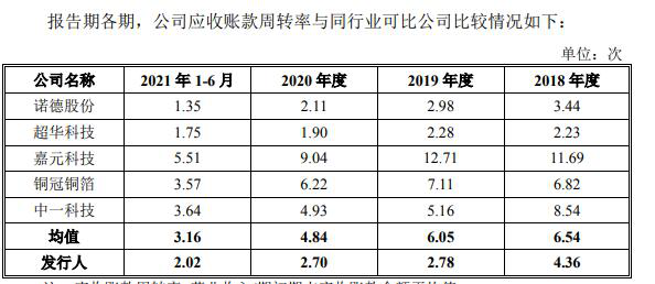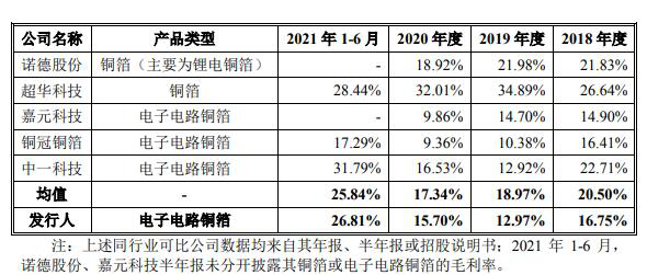 资料显示逸豪新材2018-2021年上半年,逸豪新材的营业收入分别为5.88亿元、7.56亿元、8.38亿元、6.38亿元;归属于母公司所有者的净利润分别为0.23亿元、0.26亿元、0.58亿元、0.96亿元。营业收入虽逐年上涨,但综合毛利率、主营业务毛利率波动不大,同期逸豪新材铜箔类产品的毛利率分别为16.75%、12.97%、15.7%,而同行业可比公司该产品毛利率均值分别为20.5%、18.97%、17.34%,铜箔类产品的毛利率,略低于可比同行。