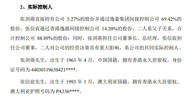 张剑萌直接持有公司 5.27%的股份并通过逸豪集团间接控制公司 69.42%的 股份,张信宸通过香港逸源间接控制公司 14.20%的股份,二人系父子关系,合 计控制公司 88.89%的股份;同时,张剑萌担任公司董事长、总经理,张信宸担 任公司董事,二人对公司的经营决策具有重大影响,系公司的共同实际控制人。张剑萌,男,出生于1963年4月,中国国籍,拥有香港永久居留权。张信宸,男,出生于1993年1月,澳大利亚国籍,拥有香港永久居留权。另外公司董事会秘书LIU LEI(刘 磊)先生也是澳大利亚国籍2018 年 12 月至今,任发行人副总经理、董事会秘书。